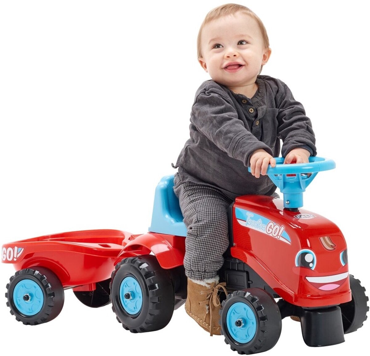 Laat je kleintje op ontdekkingsreis gaan met deze schattige ride-on tractor van Falk, inclusief aanhanger. Ideaal voor peuters vanaf ongeveer 1 jaar. De stevige tractor met vrolijke kleuren zorgt voor veel rijplezier binnen en buiten — motoriek en evenwicht worden spelenderwijs ontwikkeld. Dankzij het stuur met claxon voelt het alsof de kleintje zelf zijn eerste ritjes maakt!